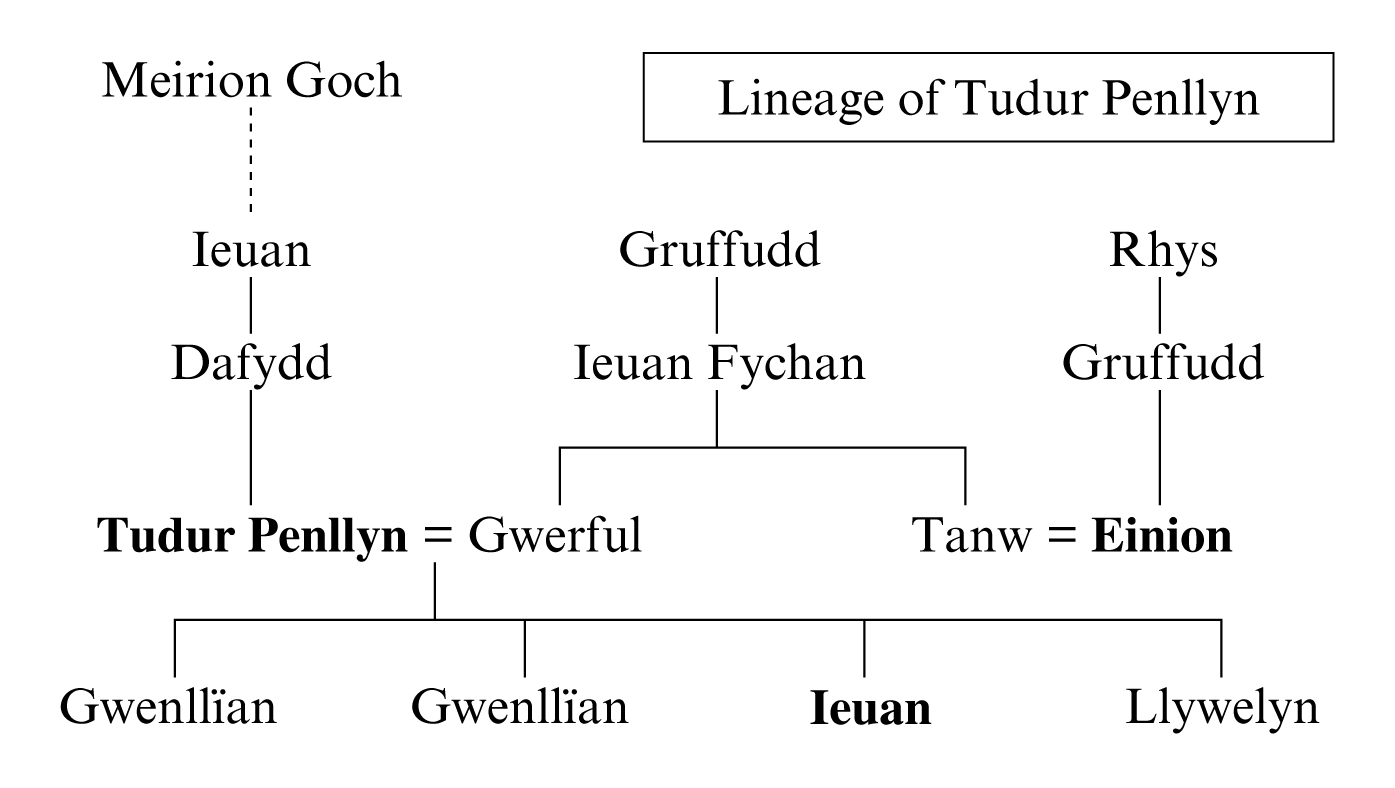 Tudur could trace his lineage back to Meirion Goch, a nobleman from Edeirnion who founded the lineage of Rhiw in Llŷn. The genealogical table below is based on WG1 ‘Meirion Goch’ 1, 3, ‘Rhirid Flaidd’ 3, 8; WG2 ‘Meirion Goch’ 3A.