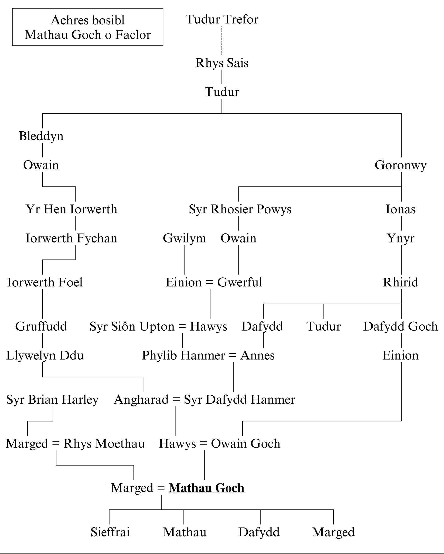 56 ŵyr Einion There is no record of a man called Einion as Matthew’s grandfather, but ŵyr ‘grandson’ could also mean ‘a descendant’ in general. According to one source, Matthew’s father was Dafydd Goch and his wife was Gwenhwyfar daughter of Ednyfed ab Iorwerth ab Einion Goch, see WG1 ‘Tudur Trefor’ 42.