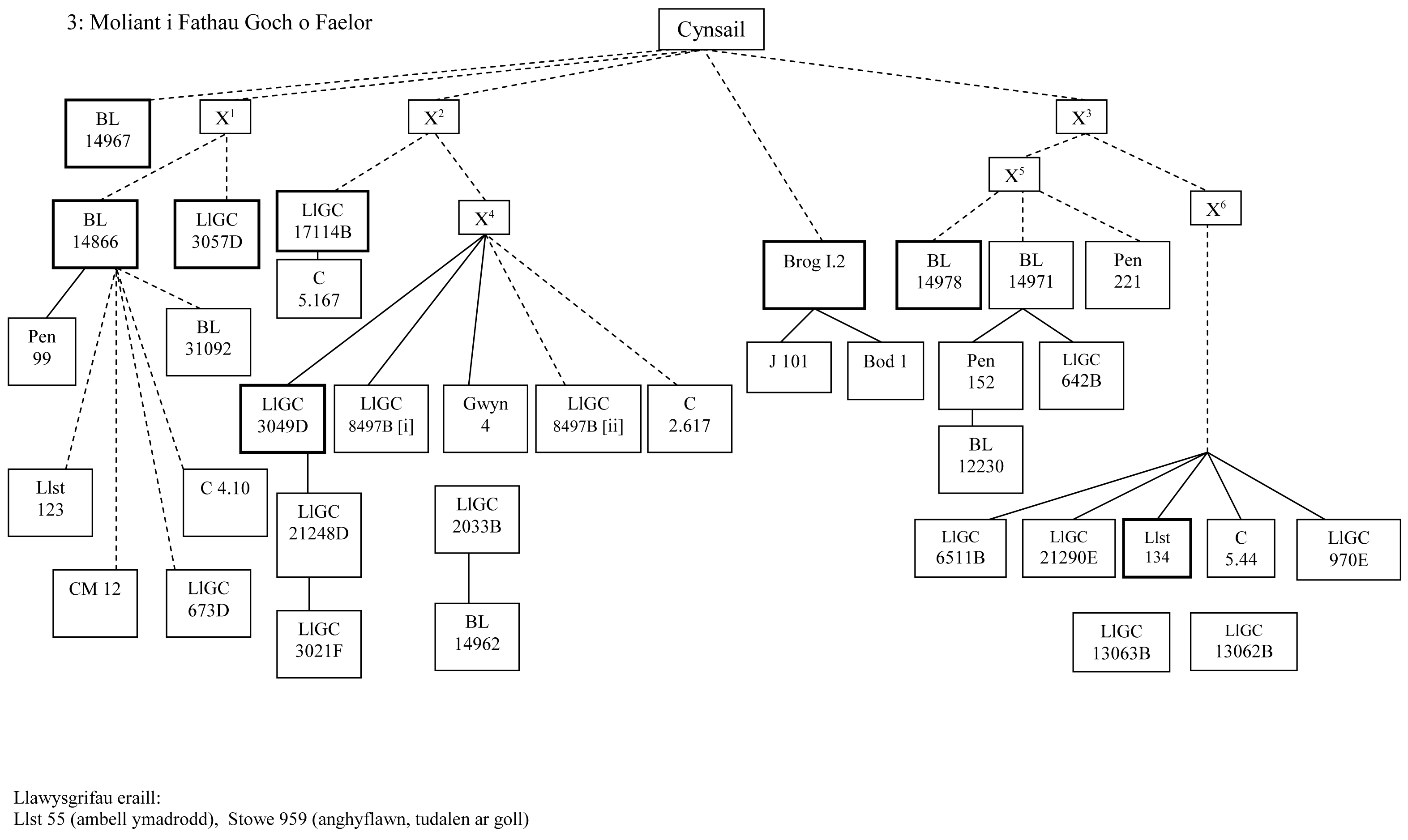 The poem occurs in 38 manuscripts. It is very unclear how some of the manuscripts are related; it is possible that what lies behind the copies which have survived are several performances of the same poem by one person who depended heavily on his memory. The earliest copy of the poem is preserved in BL 14967. Based on most of its readings, it is closely related to X1 and X2 in the stemma. However, it does have a couplet, 69–70, which also occurs in BL 14978 and BL 14971 and the manuscripts connected with Llywelyn Siôn. Other extra lines occur in Brog I.2, 53–8 and 67–8 and based on their reference to the patron’s lineage and meaning they have been included in this edition. X1 and X2 (and X4) have the same line order apart from LlGC 3057D (which has lost lines 39–40). The copy in BL 14866 sometimes shares the same variants as LlGC 3057D and possibly derives from the same source (X1). The Conwy Valley group is closely related to C 2.617 and possibly LlGC 17114B. On the whole, this group offers some good readings, but it seems that mistakes were made while copying some of the lines (e.g. losing lines 29–32 in Gwyn 4). BL 14978, BL 14971 and Pen 221 and the manuscripts connected with Llywelyn Siôn are all closely related. BL 14978 and BL 14971 are quite similar to BL 14967 on some occasions, but on others the readings are almost the same as the manuscripts of Llywelyn Siôn. However, the Llywelyn Siôn manuscripts are quite different most of the time and in general they are of no value.