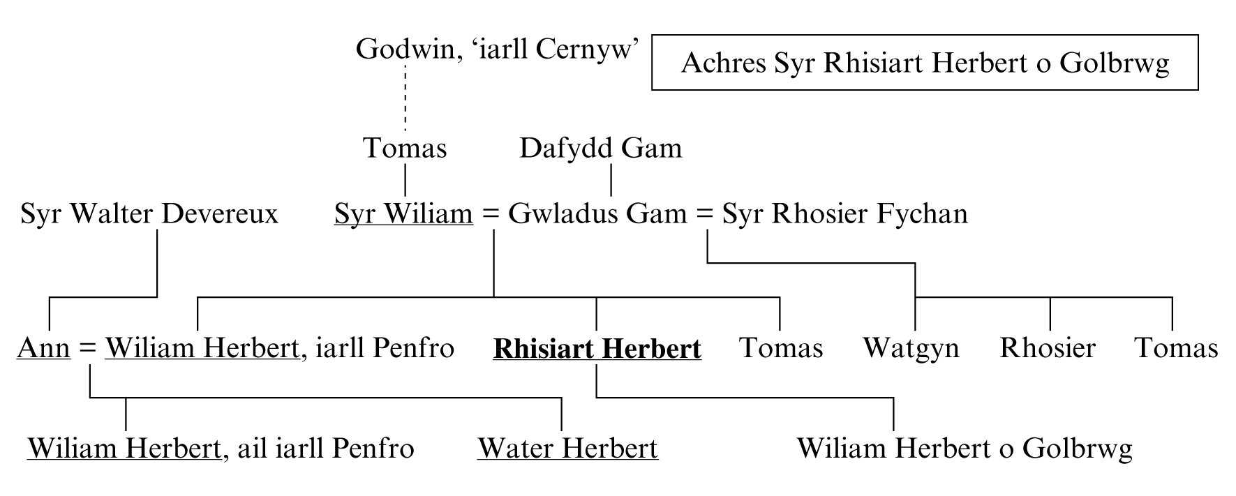 Noddwr nodedig oedd Syr Rhisiart Herbert, er mai dim ond un cywydd a erys iddo gan Guto’r Glyn (cerdd 22). Ceir awdl iddo gan Lewys Glyn Cothi (GLGC cerdd 114), cywydd mawl gan Ieuan Deulwyn (Lewis 1982: cerdd 26) ac awdl gan Huw Cae Llwyd i’w fab, Syr Wiliam Herbert o Golbrwg, a ganwyd efallai tra oedd Rhisiart yn dal yn fyw (HCLl cerdd 2). Ceir hefyd ymryson rhwng Ieuan Deulwyn a Bedo Brwynllys a gynhaliwyd ar ei aelwyd ef yng Ngholbrwg (Lewis 1982: cerddi 28 a 29). Yn olaf, ceir marwnadau gan Fedo Brwynllys (Lewis 1982: cerdd 30) a Hywel Dafi (Lewis 1982: cerdd 31) a marwnad i Risiart a’i frawd Wiliam, iarll Penfro, gan Huw Cae Llwyd (HCLl cerdd 4).