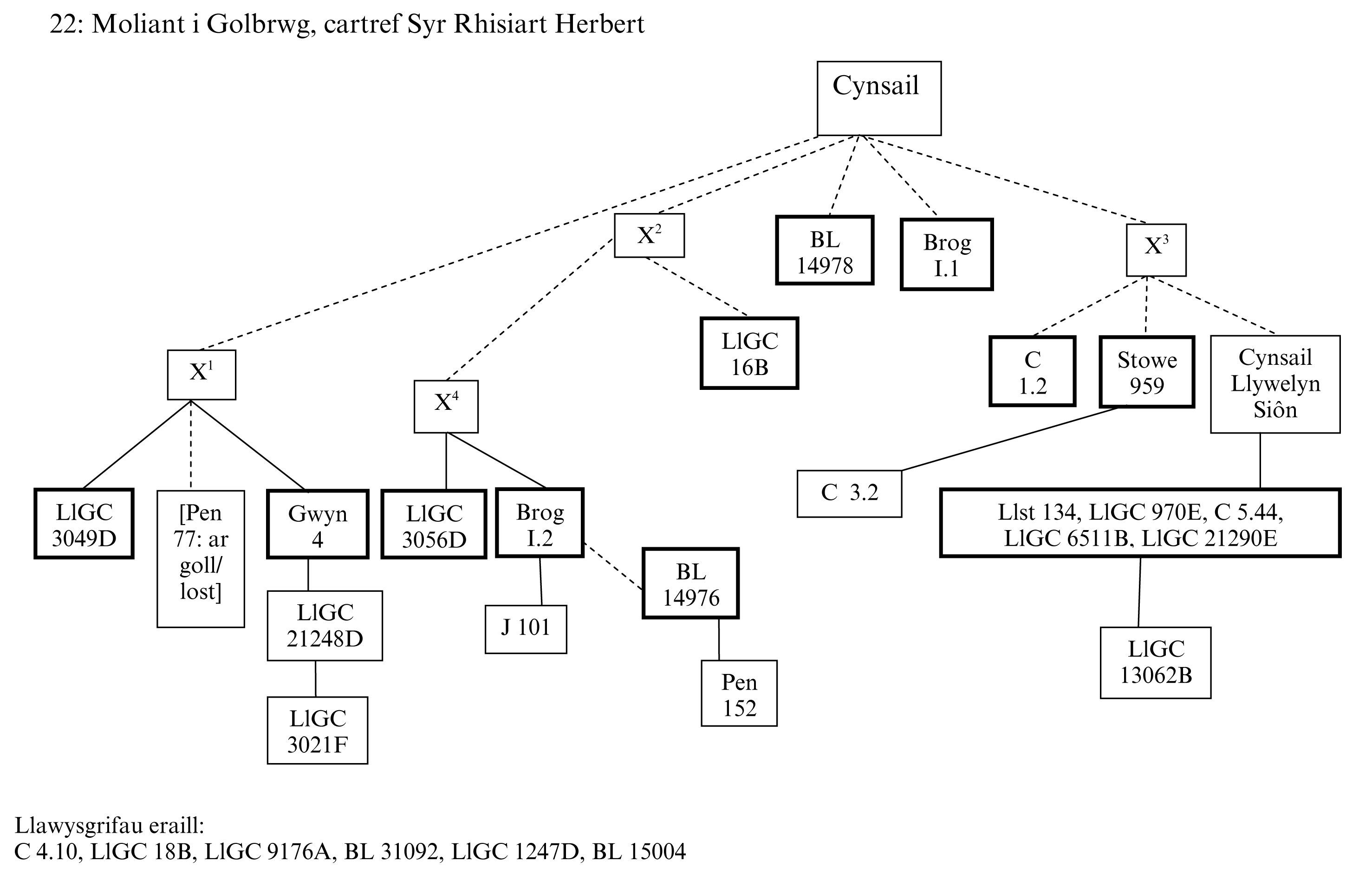 This poem is found in 28 manuscripts. LlGC 3049D and Gwyn 4 are closely related, as is the case with a number of other poems by Guto’r Glyn. Poems which occur in these two manuscripts are normally also found in LlGC 8497B or Pen 77, in the hand of Thomas Wiliems, and again with a virtually identical text. This poem is not found there, but by comparing the order in which the poems occur in all these manuscripts it is possible to see that Thomas Wiliems must have entered it into a missing quire of Pen 77, and indeed it is listed in the index of that manuscript. This group of manuscripts, the Conwy Valley group, normally offers texts of a high quality, but interestingly in the case of this poem the line order is imperfect. The correct order is available in the two copies of Humphrey Davies, LlGC 3056D and Brog I.2. These are virtually identical to one another, and both BL 14976 and LlGC 16B are close relatives of Davies’s copies, as is the case with other poems by Guto. LlGC 16B was copied from a written exemplar and the copyist had some difficulty in understanding its orthography. Brog I.1, BL 14978 and C 1.2 are all fairly corrupt and difficult to place in a stemma, but the last is related more closely to Stowe 959 and Llywelyn Siôn’s copies than are the others. Stowe 959 and Llywelyn Siôn’s five copies are close to one another, but as usual it is not possible to determine quite how they are related. In spite of their corrupt readings all of these manuscripts broadly support the line order as given by Humphrey Davies. The following, therefore, are the manuscripts which were considered in editing: LlGC 3049D, Gwyn 4, LlGC 3056D, Brog I.2, BL 14976, LlGC 16B, Brog I.1, BL 14978, C 1.2, Stowe 959, Llst 134, LlGC 970E, C 5.44, LlGC 6511B a LlGC 21290E. The other copies are dependent on the ones already discussed, and were not used for the edition. BL 31092 includes variants from a copy which has not survived and which contained some very suspicious extra couplets, probably the work of Iolo Morganwg, since the copy from which the variants were drawn is attributed to him in the heading in BL 31092.