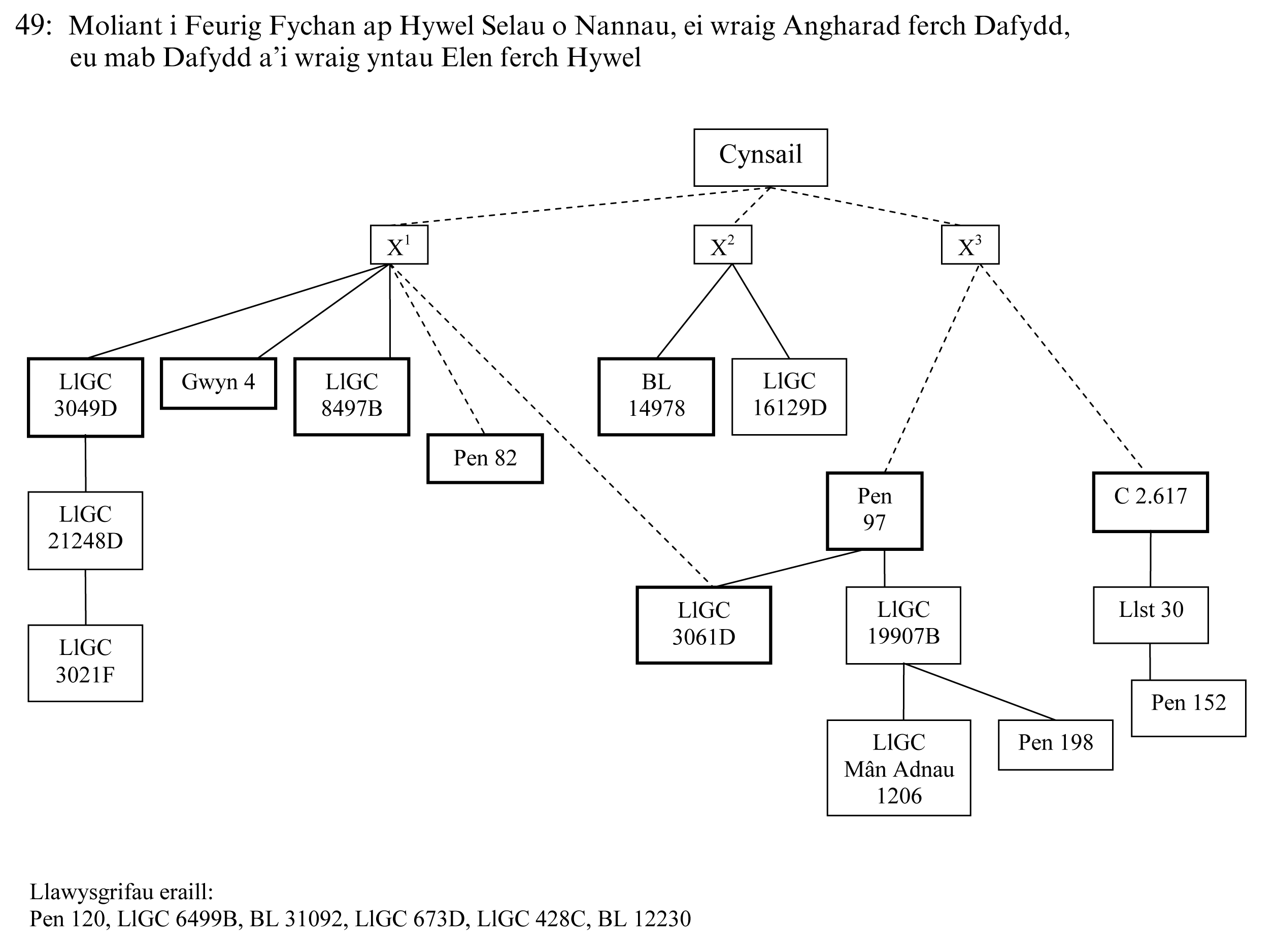 LlGC 3049D, BL 14978, Pen 97 and C 2.617 were the main manuscripts used for this edition. The remaining copies are related to one or other of these.