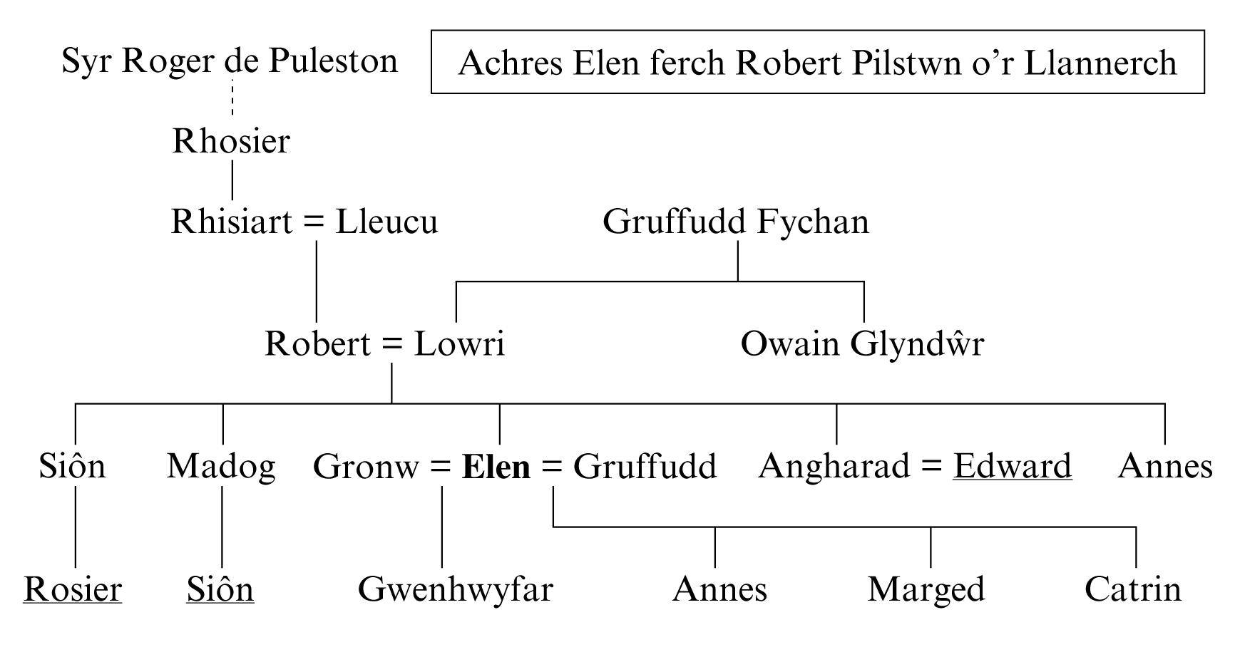 1 Elen Elen daughter of Robert Puleston, the wife of Gruffudd ap Llywelyn ap Gruffudd.