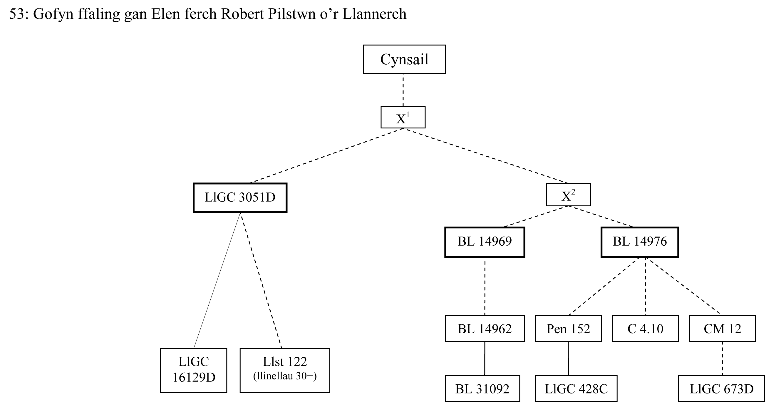 This poem occurs in 12 manuscripts. The three oldest copies are LlGC 3051D, BL 14969 and BL 14976 and it is probable that they all derive from the same exemplar (X1 in the stemma), although there are some variations (presumably due to an attempt to ‘correct’ some cynganeddion and difficult readings). LlGC 3051D seems to be the closest copy to the original version of the poem. There are clearly some variant readings in the other early copies, BL 14969 and BL 14976. They are closely related and probably derive from the same source (X2 in the stemma). Pen 152, C 4.10i and CM 12 are possibly copies of BL 14976 and the other copies are dependent on those already discussed.