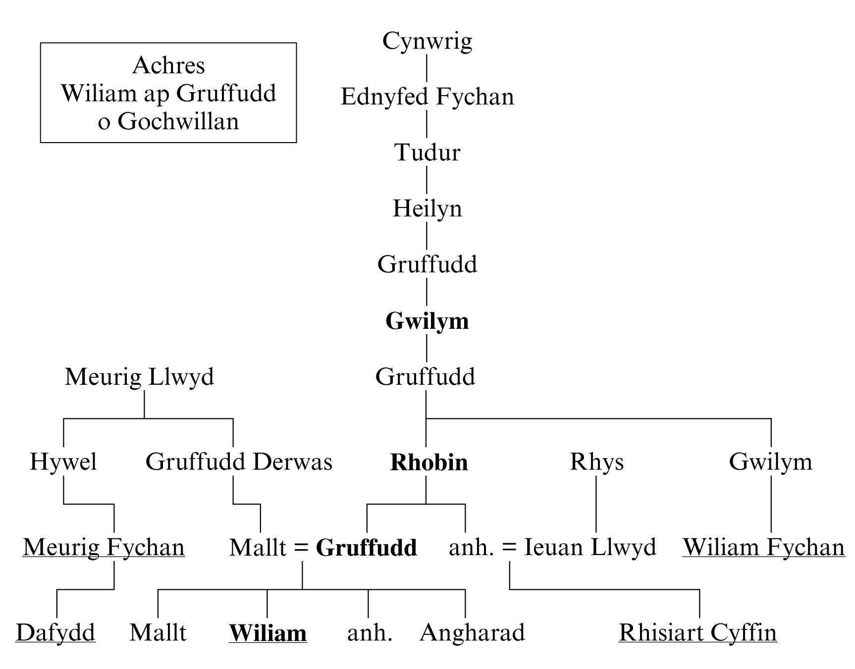Seiliwyd yr achresi isod ar WG1 ‘Bleddyn ap Cynfyn’ 50, 51, ‘Marchudd’ 4, 5, 6, ‘Osbwrn’ 2; WG2 ‘Iarddur’ 5E, ‘Marchudd’ 6 D1, D2, ‘Osbwrn’ 2 A1; GLM cerdd XLIV. Nodir mewn print trwm yr unigolion a enwir gan Guto yn y gerdd a ganodd i Wiliam, a thanlinellir enwau uchelwyr eraill a roes eu nawdd i Guto.