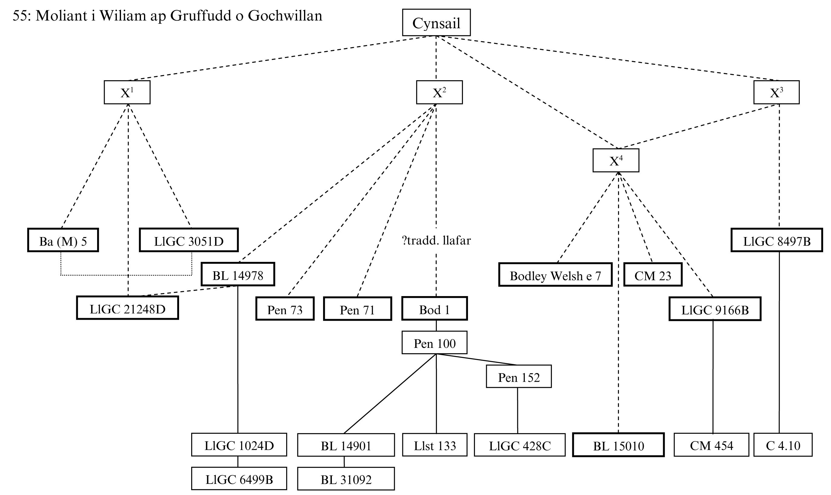 This poem occurs in 12 manuscripts. The three earliest extant copies of the poem were written by Thomas Wiliems towards the end of the sixteenth century, namely Ba (M) 5, LlGC 3051D and LlGC 8497. The first two probably shared the same source, as did LlGC 21248D, and all of these manuscripts’ texts were used extensively in this edition, as were those of BL 14978, Bod 1 (in all likelihood drawn from an oral source), Pen 71 and Pen 73 (which contains a number of variant readings that were seemingly the work of some gifted scribe). These four manuscripts probably shared another source. The text of LlGC 8497B and a few other manuscripts were drawn from yet another source of less importance. It seems that some lines were obscure or defective in the ultimate source of all the manuscripts.