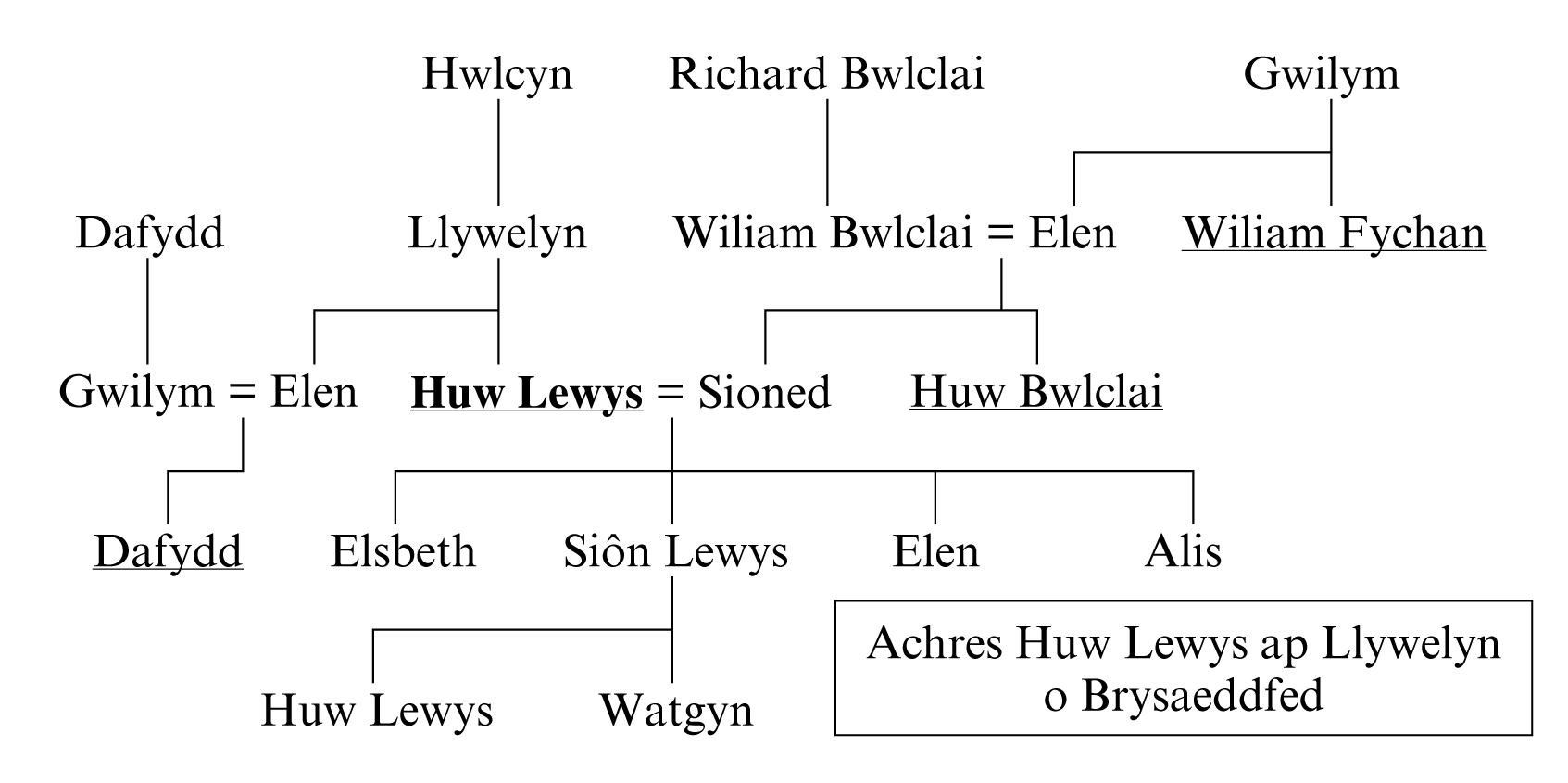 Dengys yr achres brif ddisgynyddion Huw o’i briodas gyntaf â Sioned Bwlclai a’i berthynas deuluol â thri o noddwyr eraill Guto. Gwelir ei fod yn ewythr i Ddafydd ap Gwilym o Lwydiarth, yn frawd yng nghyfraith i Huw Bwlclai o Fiwmares ac yn fab yng nghyfraith i Elen, chwaer Wiliam Fychan o’r Penrhyn.