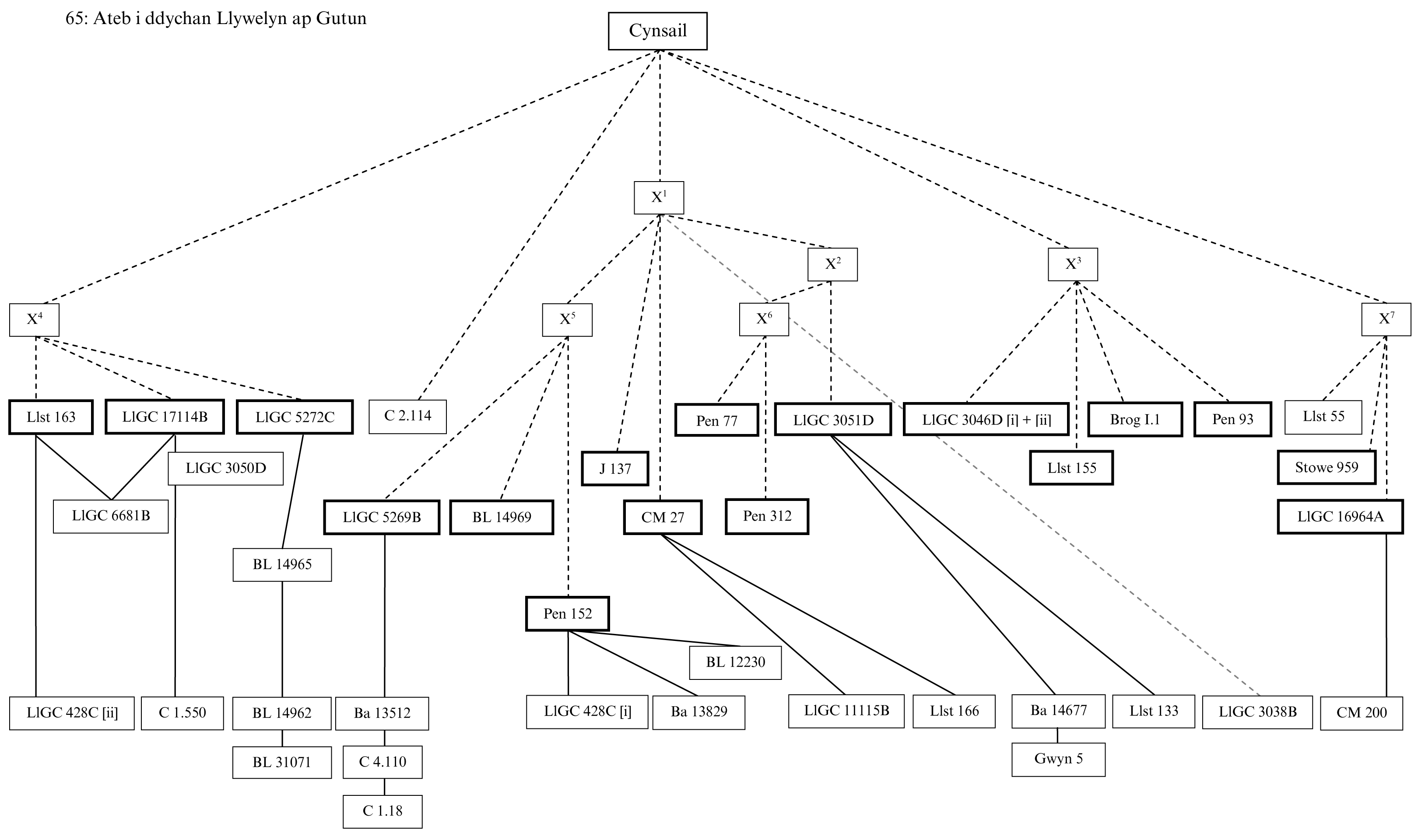 There are 40 copies of this poem in the manuscripts. Its manuscript tradition is almost identical to the manuscript tradition of Llywelyn’s poem (poem 65a) as both poems were copied together in almost every manuscript. It is therefore clear that both poems circulated together from an early date, mostly in oral form as there are eleven different versions of the present poem in terms of line order, and a complete version of the poem has survived in only two manuscripts. Nonetheless, it seems to have received a smoother transmission than Llywelyn’s poem even though both poems were as popular as each other with copyists, possibly as Guto’s poem is far more structured and would have been easier to remember as part of an oral tradition. It is possible to create an authoritative edition based mainly on the texts of Brog I.1, LlGC 3046 [i] and [ii], Llst 155 and Pen 93.
