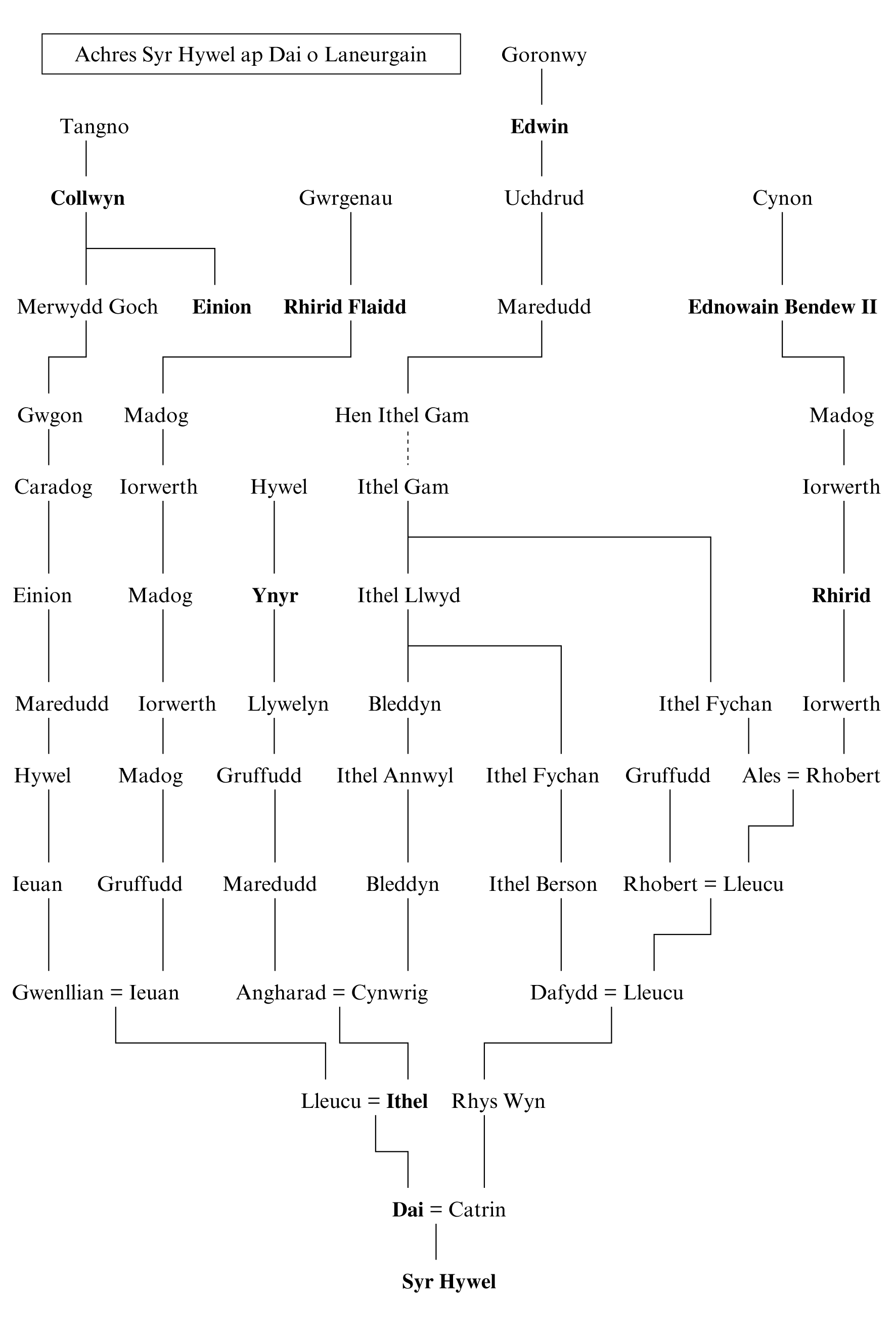 14 Ednywain Y tebyg yw mai at Ednywain Bendew II ap Cynon y cyfeirir, un o gyndeidiau Syr Hywel ar ochr ei orhennain, Lleucu ferch Rhobert ab Iorwerth. Yn ôl GGLl 12.55n, roedd Ednywain yn bennaeth un o bymtheg llwyth Gwynedd ac yn berchen ar ddau lys, ‘sef Coed y Mynydd ym mhlwyf Ysgeifiog yn sir y Fflint (gw. WATU 226), a Thref Ednywain ym mhlwyf Chwitffordd [gw. 36n Chwitffordd]’.