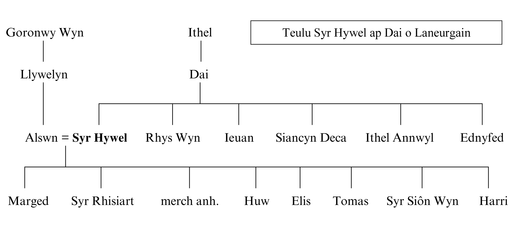 13 Ynyr In all likelihood Ynyr ap Hywel, one of Sir Hywel’s ancestors on his great-grandmother’s side, Angharad daughter of Maredudd ap Gruffudd.
