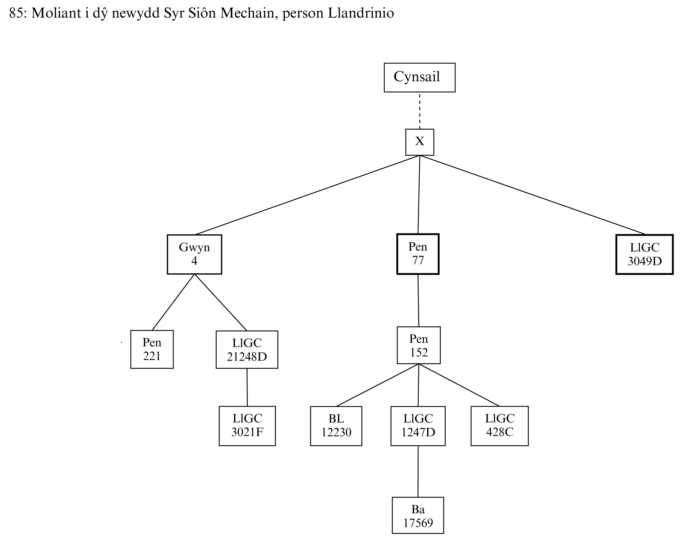 Ceir y cywydd hwn mewn 11 llawysgrif, yr un llawysgrifau ag y ceir y gerdd flaenorol i Syr Siôn Mechain ynddynt (cerdd 84) ynghyd ag un ychwanegol, sef BL 12230, copi uniongyrchol o Pen 152. Tebyg iawn hefyd yw cydberthynas y testunau. Ac eithrio Pen 221, sy’n cynnwys cwpled yn unig (arni, gw. 1n), mae’r testunau’n cynnwys 62 o linellau. Ychydig o amrywio geiriol a geir rhyngddynt, yr un yw trefn sylfaenol eu llinellau a chywir iawn yn gyffredinol yw’r darlleniadau. Diau eu bod i gyd yn tarddu o’r un gynsail ysgrifenedig. Maent i gyd yn gysylltiedig â gogledd Cymru.