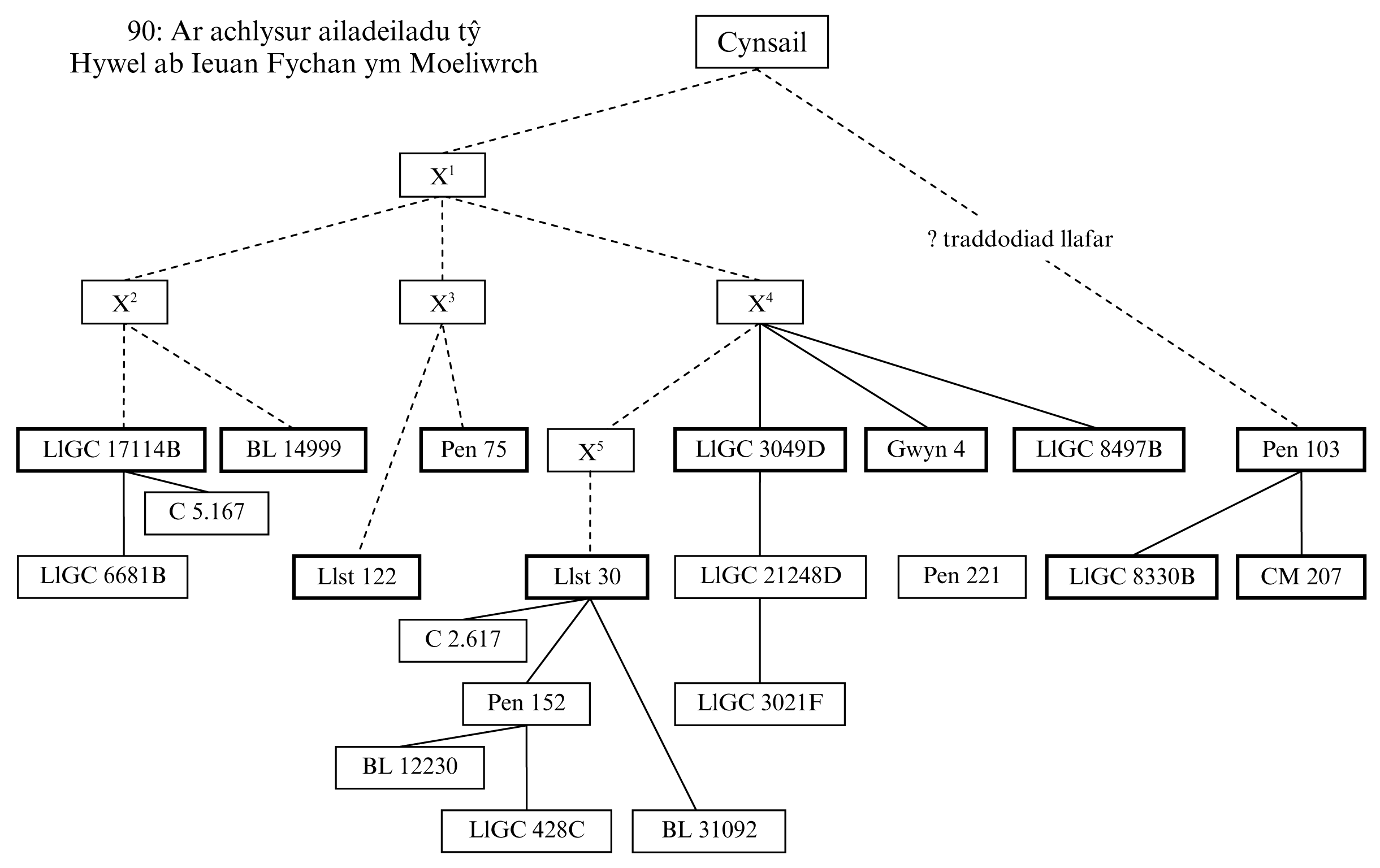 Mae’n bosibl y ceid ffynhonnell neu ffynonellau eraill rhwng X2 a BL 14999 (am ryw reswm ni chofnodwyd y gerdd iacháu yn y llawysgrif hon), ond mae’n debygol iawn y gellir gwahaniaethu rhwng X2 a’r llawysgrifau eraill ar sail llinellau 38 nith y ty a 50 lloer gain. Y prif ddarlleniadau sy’n gosod X3 ar wahân yw llinellau 50 hirgoed a 58 nawdd dduw. Amheuir bod llawysgrif goll rhwng testun Llst 30 ac X4 (sef X5; cf. stema cerdd 19) ond na cheid ynddi ddim o werth nas ceir yn y tair prif lawysgrif a ddeilliodd o X4. Anos penderfynu beth a geid yn llawysgrif goll X4 yn achos rhai llinellau gan ei bod yn rhesymol tybio i Thomas Wiliems ddiwygio ei destun ef o’r gerdd yn LlGC 8497B, yn ogystal â William Salesbury yntau yn Gwyn 4. Ymgynghorir â thestun Llst 30 yn achlysurol, felly, lle bo amheuaeth ynghylch darlleniadau X4. Mae’n bosibl mai yn LlGC 3049D y ceir y copi ffyddlonaf, ond ymddengys yn waith copïydd digon trwsgl ar adegau.