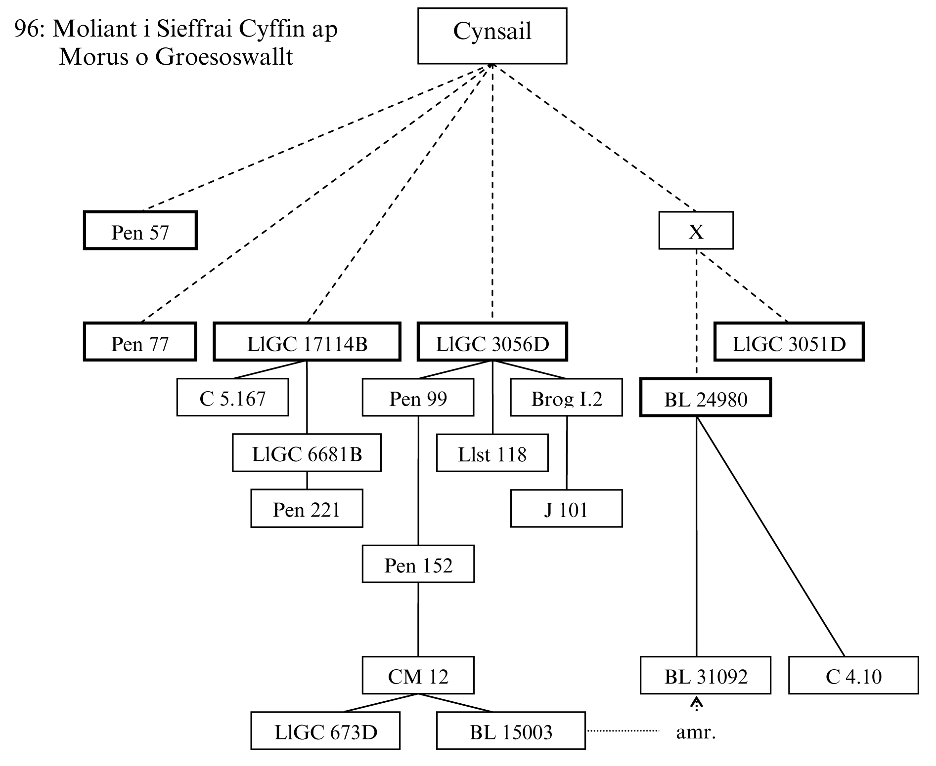36 o’i flaen Dilynir Pen 77 a LlGC 17114B. Gthg. Pen 57 a LlGC 3056D o flaen. Bernir bod y cyntaf yn fwy synhwyrol.