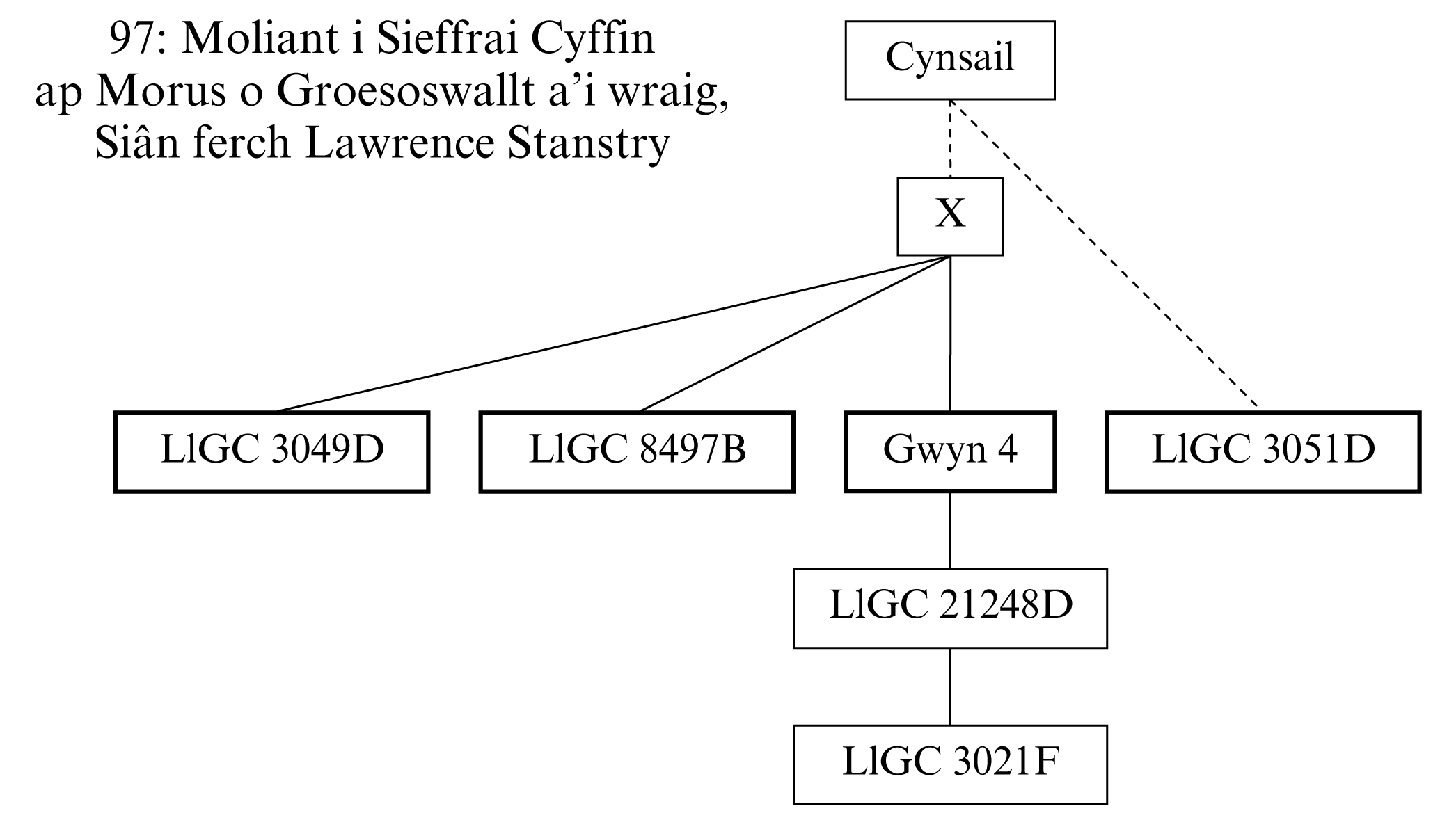 This poem survives in six manuscript copies. Gwyn 4, LlGC 3051D and LlGC 8497B derive from a lost manuscript which contained an extensive collection of Guto’s work and which was written, in all likelihood, in Dyffryn Conwy. The collective evidence of these three manuscripts faithfully reflects the text of the lost source, which was fortunately in good condition. The text of LlGC 3051D is incomplete and was probably derived from an oral source.