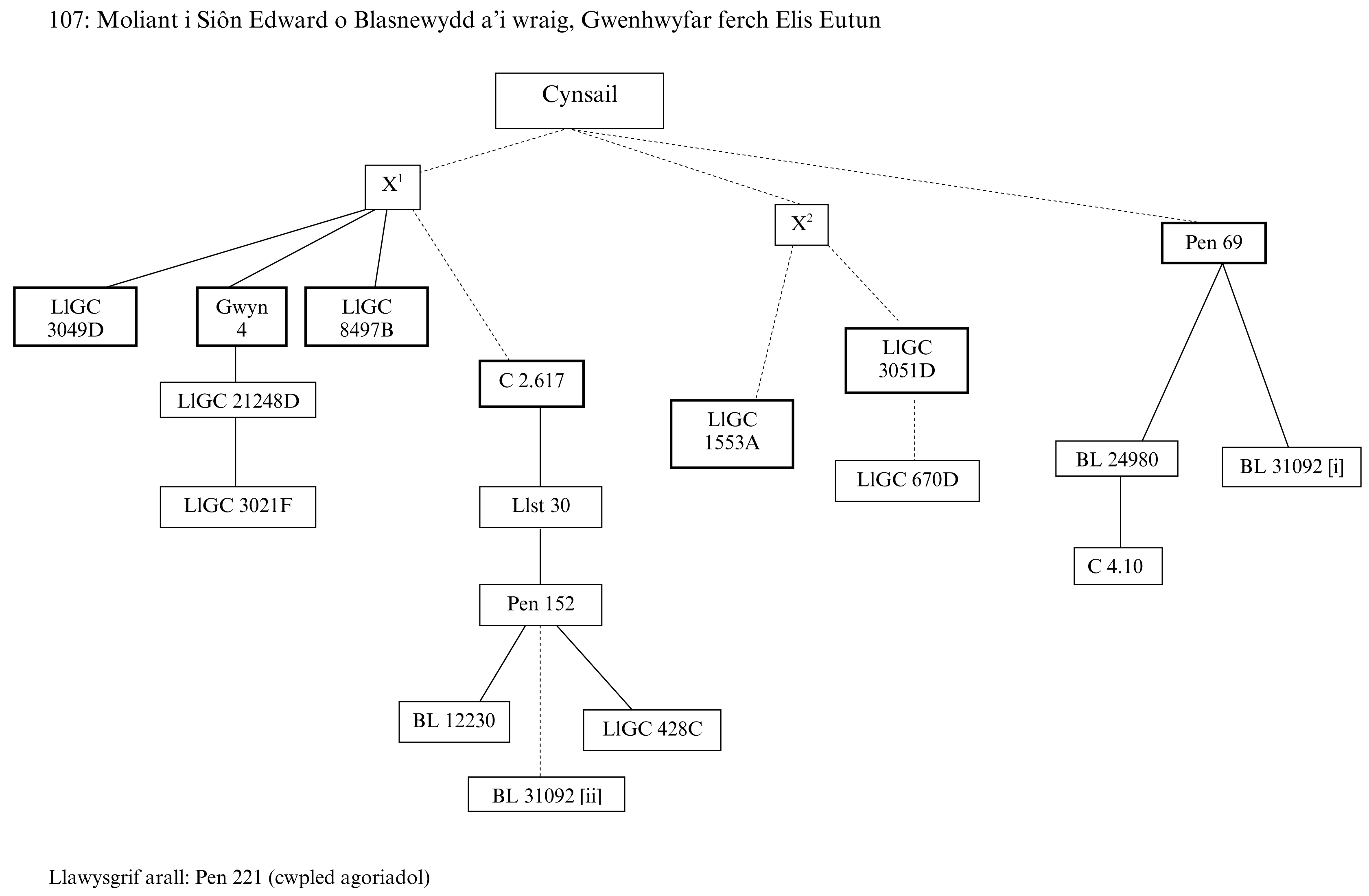 There are 19 manuscript copies of this poem, ranging in date from the mid-sixteenth century to the nineteenth. The copies are fairly similar, and we can assume that they derive ultimately from one common source, not too far removed from the original (which may well have been a written source kept at Plasnewydd, given Siôn Edward’s literary interests). The variant readings suggest three general groups: i. the north-eastern manuscripts, deriving from Rhys Cain of Oswestry’s copy in Pen 69; ii. the manuscripts of the Conwy Valley, which derive from X1 in the stemma, the direct source of LlGC 8497B, LlGC 3049D, and Gwyn 4; C 2.617 also belongs to this group; iii. LlGC 1553A and LlGC 3051D, which are rather loosely related, with LlGC 3051D often showing an uncertain relationship with C 2.617.