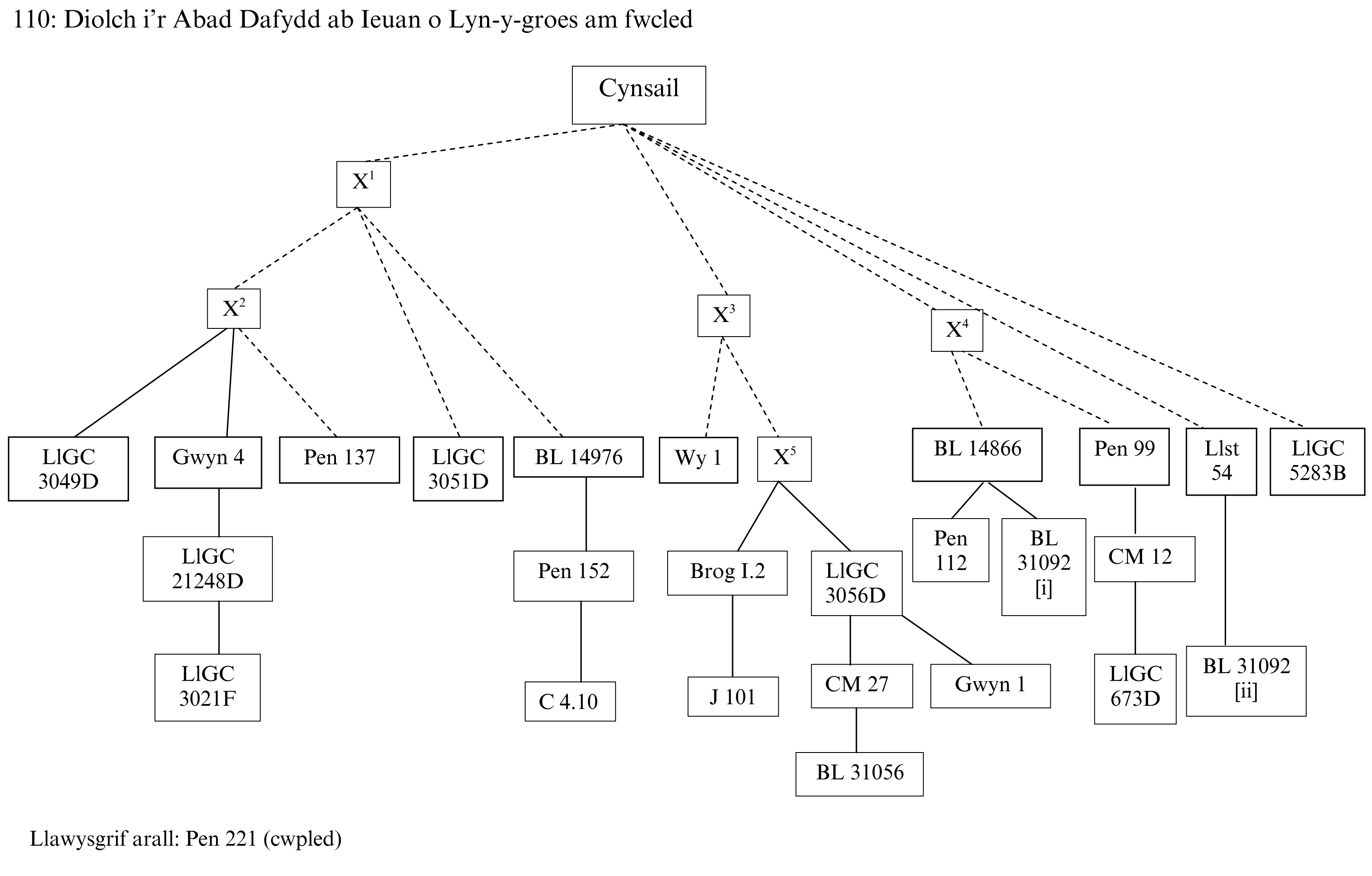 The manuscripts divide into those that read enaid Dafydd in line 7 and derive from X1 in the stemma, and those that read oed Dafydd, the better reading. X1 was the source for the copies in LlGC 3051D and BL 14976, and also of X2, the lost exemplar from the Conwy Valley, which was the source for LlGC 3049D, Gwyn 4 and Pen 137. The rest of the manuscripts fall into groups which derive from the source: two main groups, X3 (Wy 1, Brog I.2 and LlGC 3056D, &c.) and X4 (BL 14866 and Pen 99, &c.), and two manuscripts (Llst 54 and LlGC 5283B) whose relationship to the rest is difficult to assess. In GGl preference is often given to BL 14866 and Pen 99, even when they diverge from all the other manuscripts.