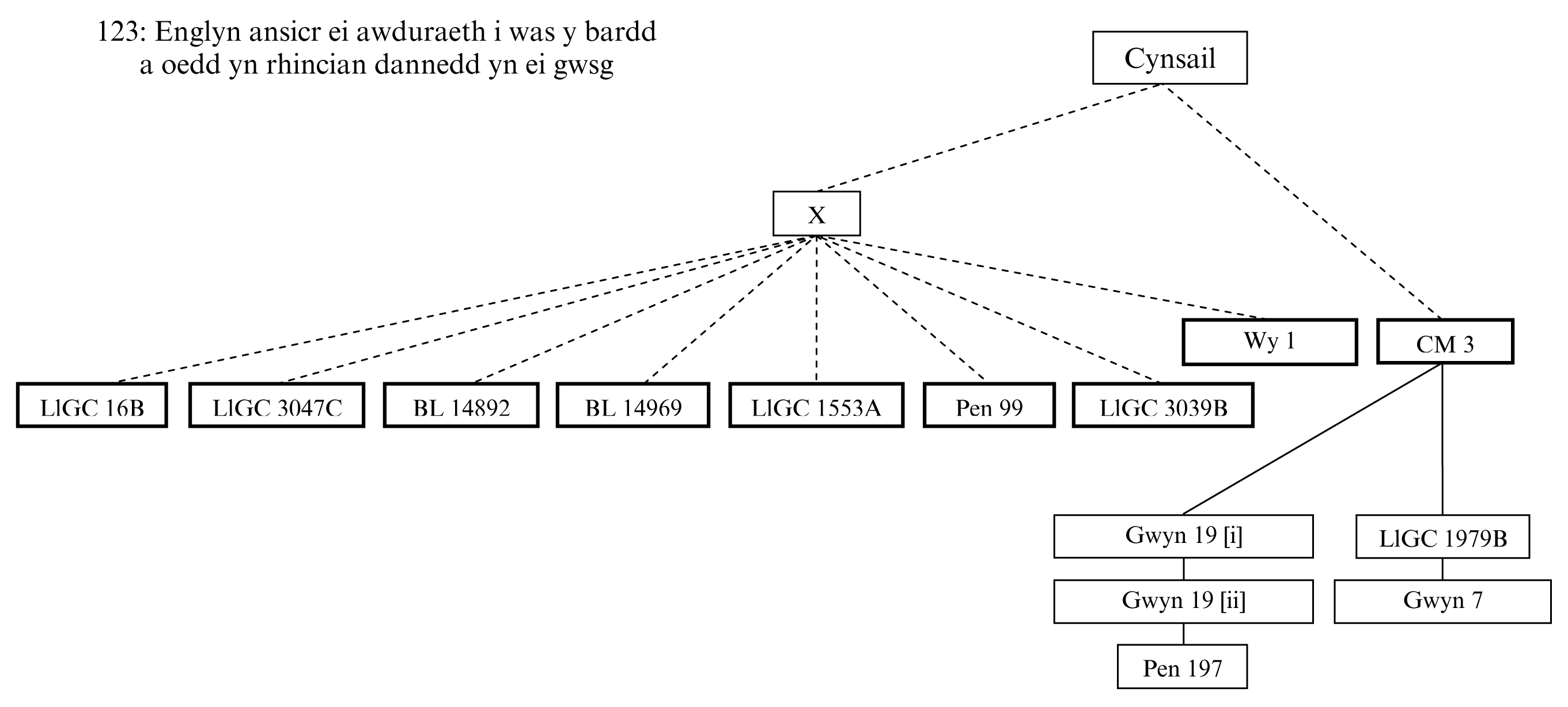 The poem has survived in 14 manuscript copies. It was copied with poem 124 in a handful of manuscripts and both poems may have been associated at one time. The edition is based mainly upon the evidence of CM 3, LlGC 1553A and Wy 1.