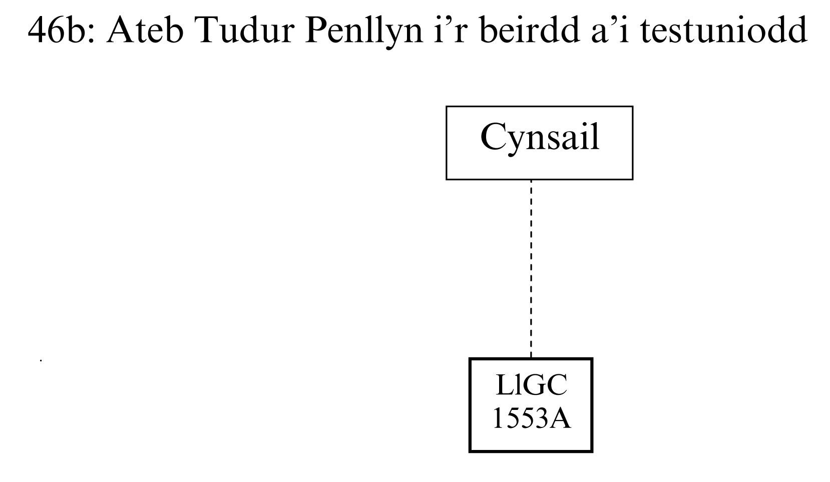 This poem is a series of nine englynion unodl union where Tudur Penllyn answers the poets who had made him a cyff clêr (‘minstrels’ butt of satire’) on the theme that the wolf has taken his testicles (see poems 46, 46a). Note in particular his exhortation to the other poets to wear llodrau (line 4) and not to go the way he had gone Heb ladd o gŵn a bleiddiau (36). (Tudur also says in another series of englynion that there had been talk in the mansions of Nannau in Llanfachreth and Rug by Corwen that he had been injured in his groin by a wolf, see GTP 36.II.5–8.) He names nine of the poets: Guto, Robert, Hywel, Siôn Rheinallt, Gutun Owain, Gutun o Arfon, Siôn Conwy, Dafydd, Deio Bŵl; Ieuan ap Tudur Penllyn is referred to as the gwas sy fab i minnau (10), thus making a total of ten. Except in the case of Guto’r Glyn and Ieuan ap Tudur Penllyn, none of the poems sung by these poets on the occasion has survived. In his edition of the poem in GTP 36.VII, Thomas Roberts did not include the second, third and eighth stanzas because he judged them to be of no value; they are nonetheless part of the poem and the references to Guto, his servant Rhys and Ieuan in the second and third stanzas are important.